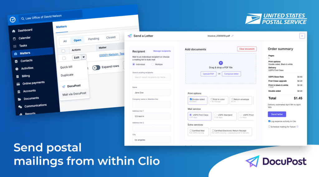 Streamline your legal workflow with the powerful DocuPost + Clio integration, designed to let attorneys send physical mail directly from their existing case management environment. Whether you’re working from a Matter, Contact, or Document in Clio, you can instantly trigger compliant, professional mailings—no exporting, printing, or manual handling required. From demand letters and court notices to client correspondence and invoices, DocuPost brings the speed of modern software to traditional mail, helping law firms save time, reduce errors, and maintain a seamless digital-to-physical workflow.